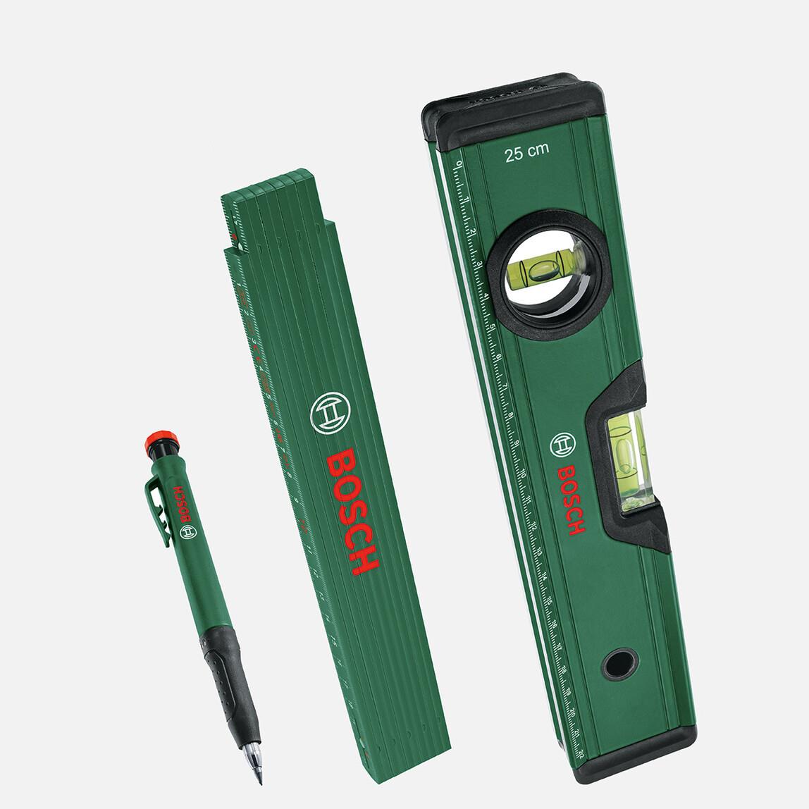 • Cam elyaf takviyeli naylondan üretilmiş sağlam, yüksek kaliteli 2m katlanır cetvel, 0,05mm/m hassasiyetle yatay ve dikey olarak okunması kolay, yüksek hassasiyetli 25cm su terazisi ve çıkarılabilir kapağı sayesinde 3,9cm uzunluğunda derinlik işaretleme kalemine dönüşen, geri çekilebilir bir kalemden oluşan çok yönlü bir işaretleme seti.