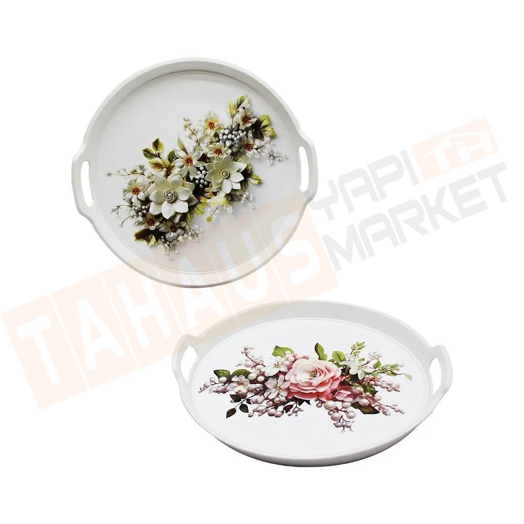 Estetik ve Şık Sunum: Misafirlerinize şık bir sunum yapmak için ideal olan bu tepsi, hem evde hem de dış mekanlarda rahatlıkla kullanılabilir. Çiçek desenli yüzeyi ve yuvarlak yapısı, çeşitli yemek ve içecekleri zarif bir şekilde servis etmek için mükemmel bir seçimdir.